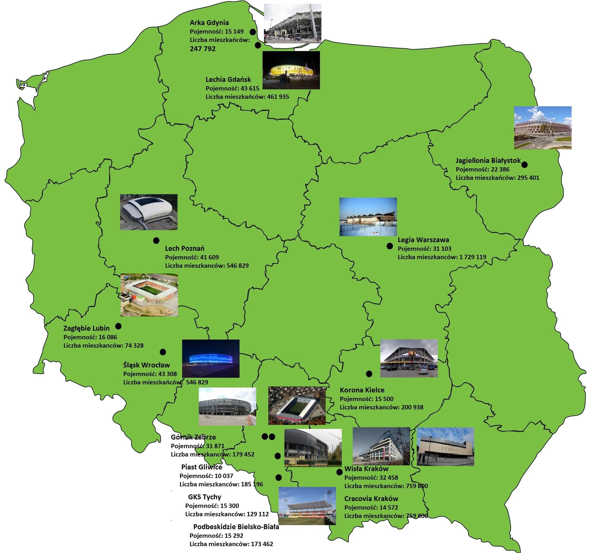 PGE نارودوي، المعروف أيضا باسم Stadion نارودوي w وارزواي وملعب وارسو الوطني، هو بولندا ملعب وطني جديد. يقع استاد وارسو الوطني على الضفة الشرقية لنهر فيستولا، وليس بعيدا عن وسط مدينة وارسو كما هو مذكور في خريطة استاد بولندا. تم بناء ملعب سلاسكي، الذي يشار إليه أيضًا باللغة الإنجليزية باسم ملعب سيليزيا، في الخمسينيات. هو افتتح رسميّا فوق 22 يوليو-تمّوز 1956 مع مباراة بين بولندا وألمانيا شرقيّة وطنيّة (0-0). كان ملعب سلاسكي ملعبًا على شكل وعاء مع مضمار الجري الذي يمكن أن يحزم حوالي 90,000 متفرج، ولكن في بعض الأحيان سجل حضورًا لأكثر من 100,000 متفرج. تم بناء Stadion Miejski w Wrocławiu (ملعب بلدية Wroclaw) ليكون بمثابة مكان للعب في بطولة يورو 2012. بدأت أعمال البناء في عام 2009 واكتملت في يناير 2011. افتتحت INEA Stadion، التي كانت تعرف سابقًا باسم Stadion Miejski، في عام 1980 بعد فترة بناء مدتها 12 عامًا.